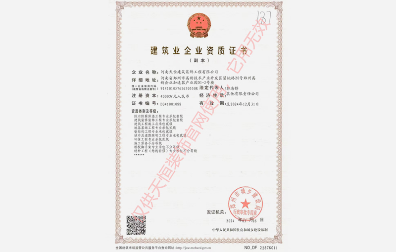 河南天恒建筑裝飾工程有限公司建筑業(yè)企業(yè)資質(zhì)